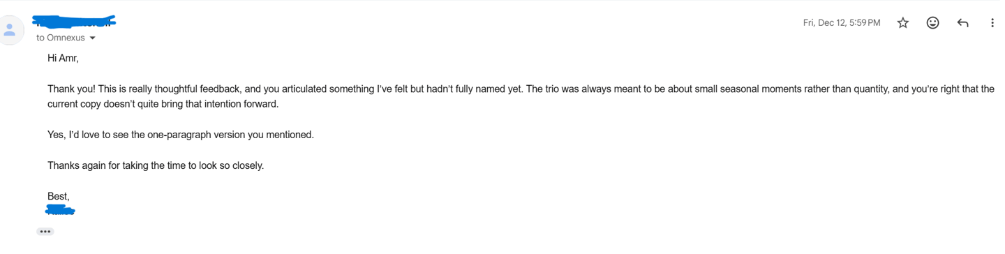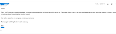 “This is really thoughtful feedback… you articulated something I’ve felt but hadn’t fully named yet.”